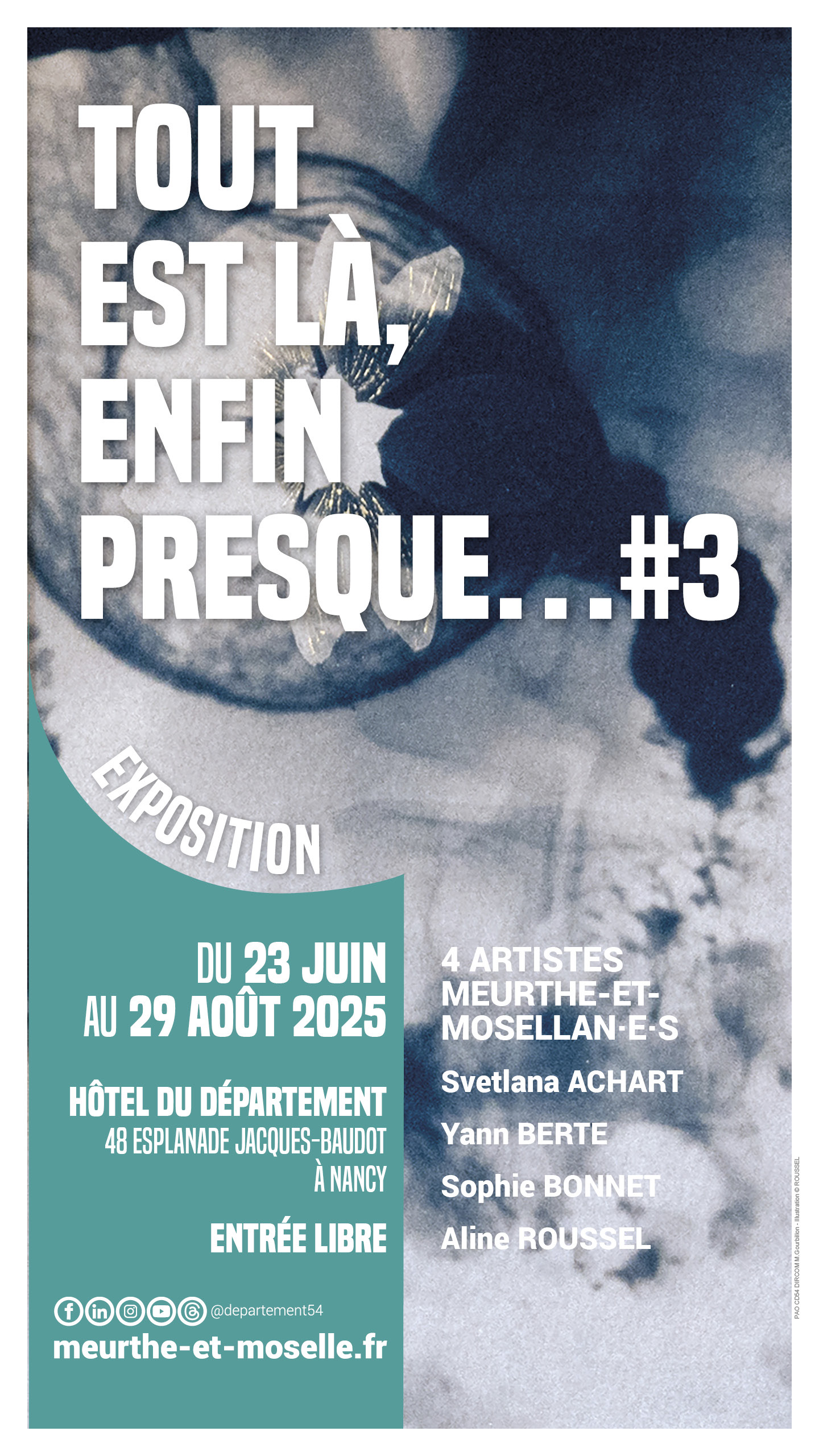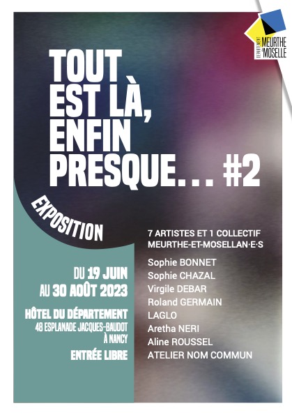 - 19 Juin – 30 Août 2023 : Exposition collective, « Tout est là, enfin presque … #2 », Hôtel du Département, Nancy (54) – voir l’Affiche